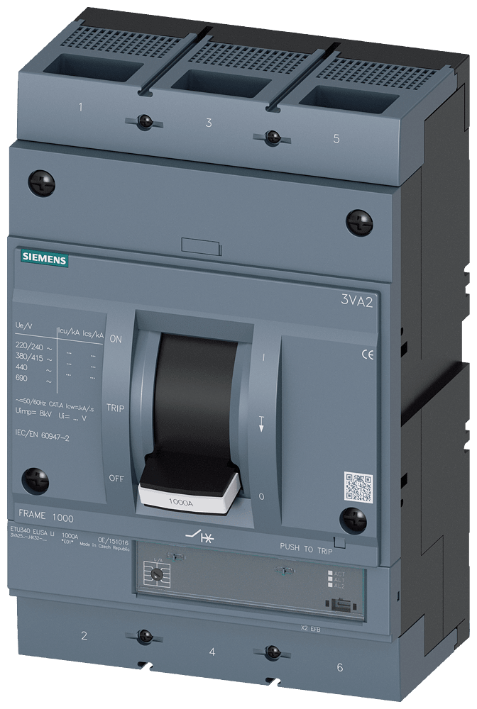 SIEMENS - interruttore automatico 3VA2 IEC frame 1000 classe del potere di interruzione C Icu=110kA con 415V a 3 poli, protezione impianto ETU340, ELISA LI, ... 3VA25637HK320AA0