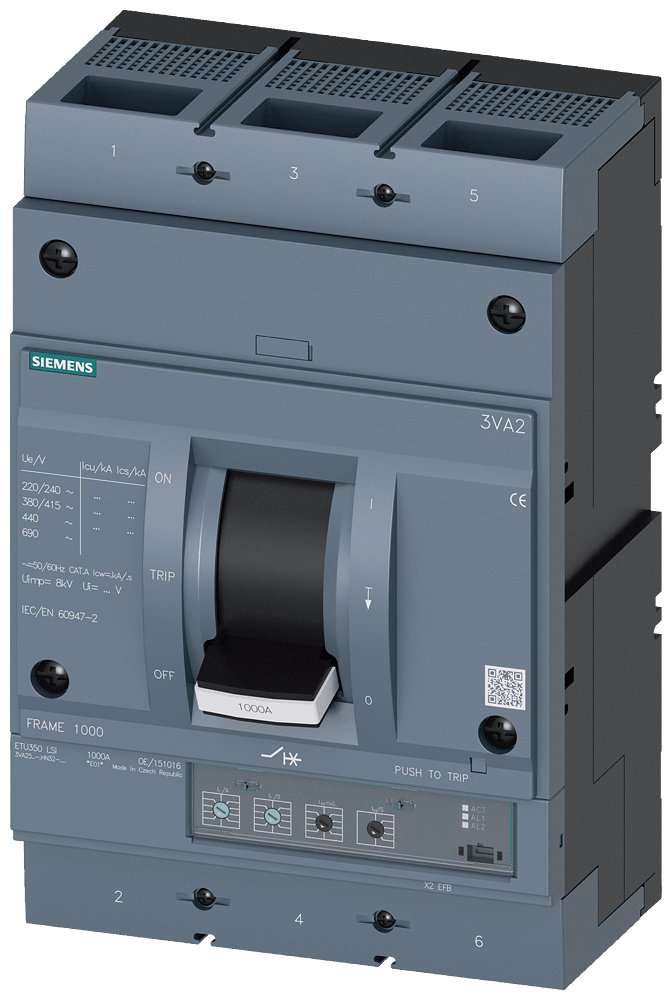 SIEMENS - interruttore automatico 3VA2 IEC frame 1000 classe del potere di interruzione M Icu=55kA con 415V a 3 poli, protezione impianto ETU350, LSI, In=800... 3VA25805HN320AA0