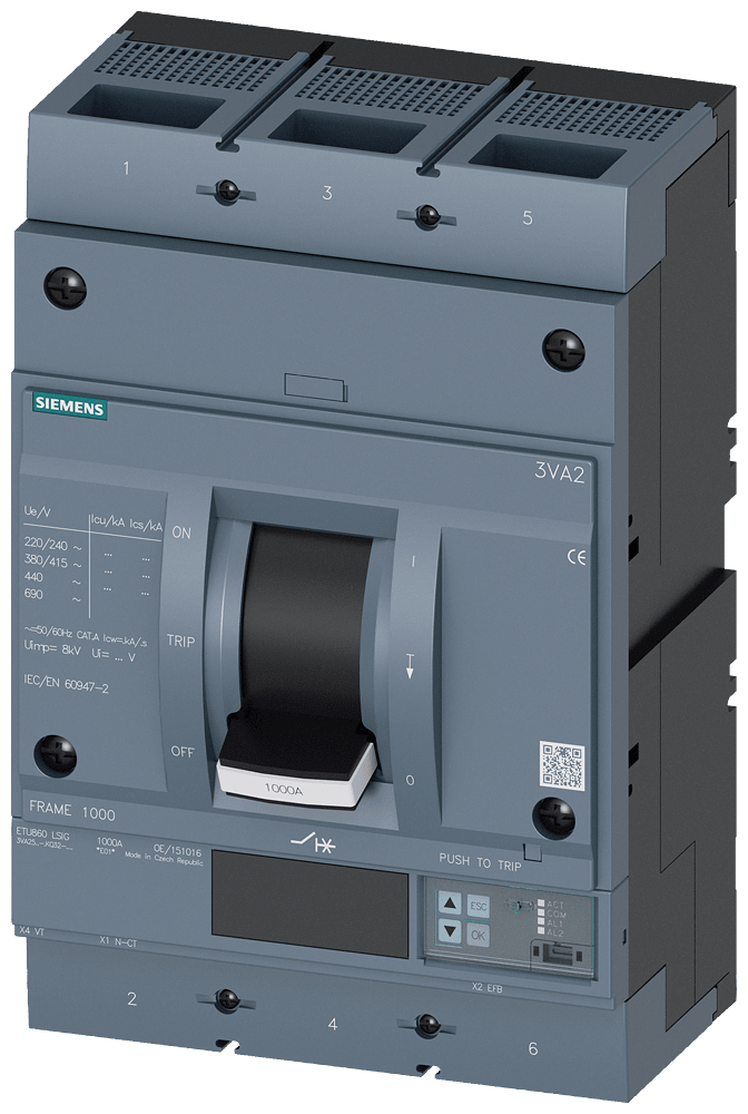 SIEMENS - interruttore automatico 3VA2 IEC frame 1000 classe del potere di interruzione M Icu=55kA con 415V a 3 poli, protezione impianto ETU860, LSIG, In=80... 3VA25805KQ320AA0