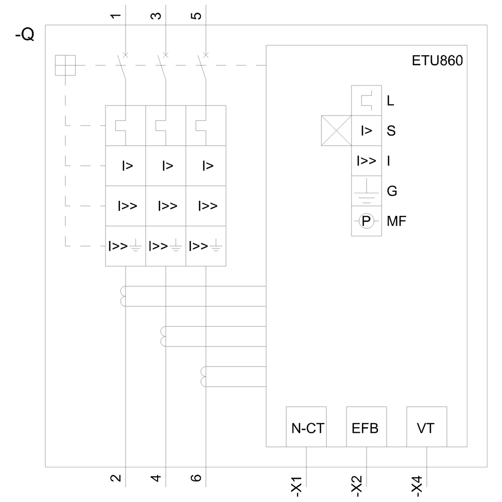 interruttore automatico 3VA2 IEC frame 1250 classe del potere di interruzione C Icu=110kA con 415 V a 3 poli, protezione impianto ETU860, LSIG, In=1250A protezione da sovraccarico Ir=500A ...1250A protezione da cortocircuito Isd=0,6..10x In, Ii=1,5..10x In protezione del conduttore di neutro opzionale con CT est. fino al 160% protezione da guasto verso terra, disinseribile Ig=0,2... 1 x In, tg=0,05...0,8s attacchi a sbarra divaricati Interruttore automatico scatolato SENTRON 3VA2 per una protezione impianto efficace grazie alla disinserzione sicura in caso di sovraccarico e cortocircuito. Gli interruttori automatici scatolati 3VA fissano standard di riferimento per quanto riguarda flessibilità e varietà di elementi modulari con ingombro ridotto. Gli interruttori automatici scatolati 3VA2 sono disponibili in esecuzione a 3 e 4 poli con diverse correnti permanenti nominali per il montaggio in esecuzione fissa nonché in esecuzione rimovibile/estraibile. Gli accessori modulari e facili da installare, con un'ampia gamma di funzioni, sono omogenei per tutte le grandezze costruttive e tutte le serie costruttive di interruttori automatici scatolati 3VA. Interruttori automatici scatolati SENTRON 3VA - un sistema. Per tutte le applicazioni.