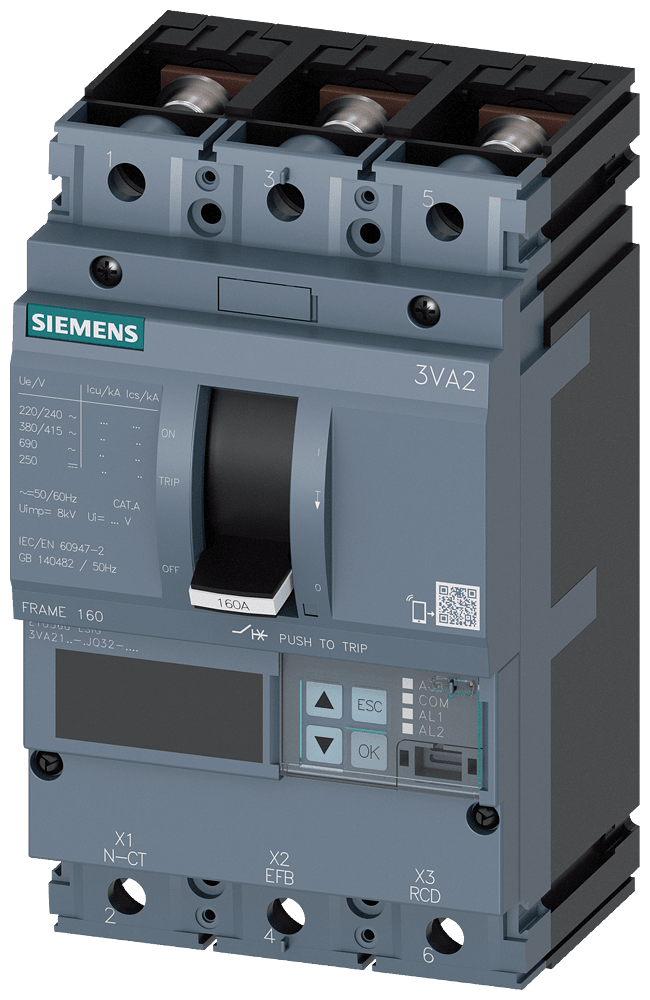 SIEMENS - interruttore automatico 3VA2 IEC frame 160 classe del potere di interruzione C Icu=110kA con 415V a 3 poli, protezione impianto ETU560, LSIG, In=40... 3VA21407JQ320AA0