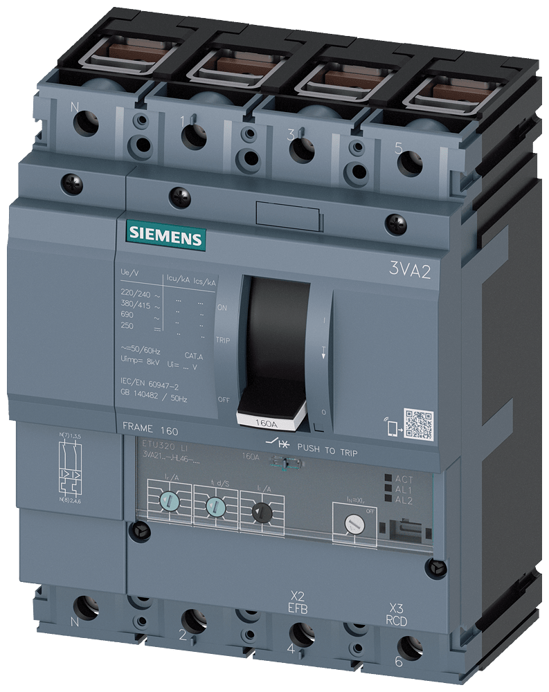 SIEMENS - interruttore automatico 3VA2 IEC frame 160 classe del potere di interruzione C Icu=110kA con 415V a 4 poli, protezione impianto ETU320, LI, In=100A... 3VA21107HL460AA0