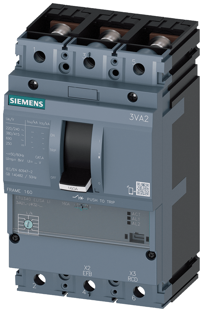 SIEMENS - interruttore automatico 3VA2 IEC frame 160 classe del potere di interruzione L Icu=150kA con 415V a 3 poli, protezione impianto ETU340, ELISA LI, I... 3VA21638HK320AA0