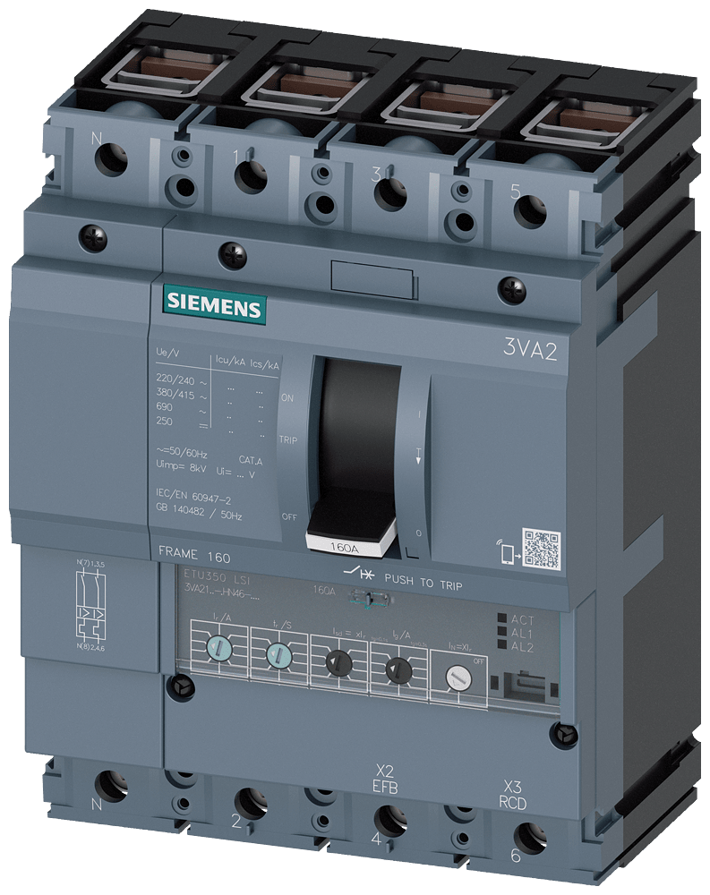 SIEMENS - interruttore automatico 3VA2 IEC frame 160 classe del potere di interruzione M Icu=55kA con 415V a 4 poli, protezione impianto ETU350, LSI, In=160A... 3VA21165HN460AA0
