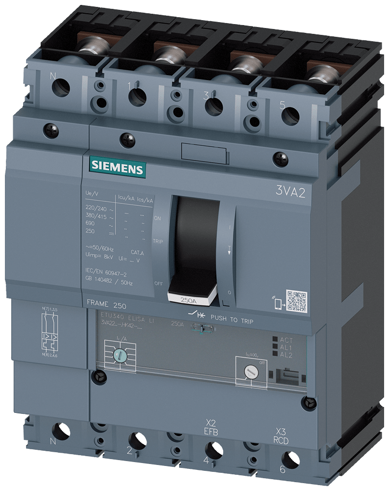 SIEMENS - interruttore automatico 3VA2 IEC frame 250 classe del potere di interruzione L Icu=150kA con 415V a 4 poli, protezione impianto ETU340, ELISA LI, I... 3VA22168HK420AA0