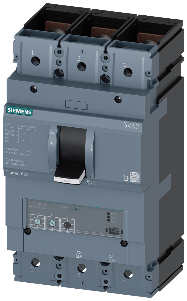 SIEMENS - interruttore automatico 3VA2 IEC frame 630 classe del potere di interruzione C Icu=110kA con 415V a 3 poli, protezione motore ETU350M, LSI, In=400A... 3VA24407MN320AA0