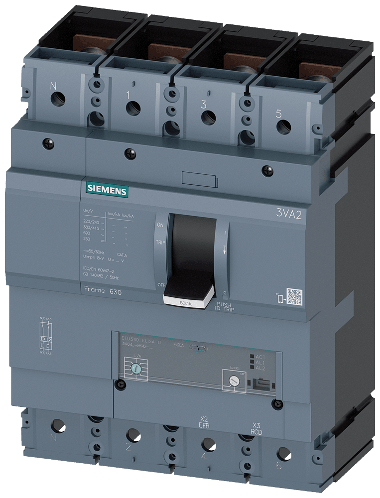 SIEMENS - interruttore automatico 3VA2 IEC frame 630 classe del potere di interruzione H Icu=85kA con 415V a 4 poli, protezione impianto ETU340, ELISA LI, In...