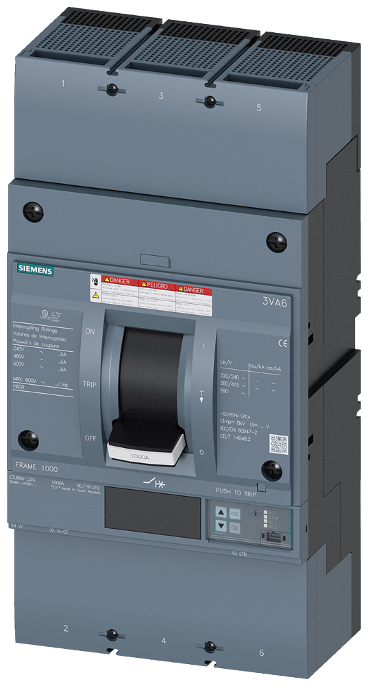 SIEMENS - Interruttore automatico 3VA6 UL Frame 1000, classe del potere di interruzione M, 35 kA con 480 V a 3 poli