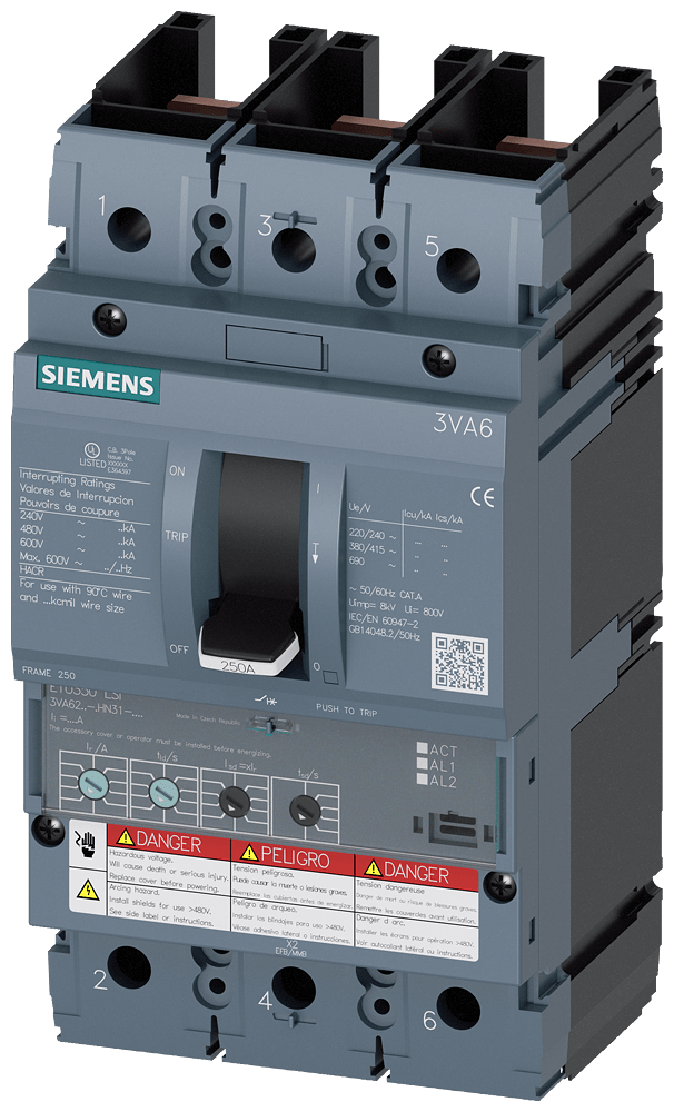SIEMENS - Interruttore automatico 3VA6 UL Frame 250, classe del potere di interruzione M, 35 kA con 480 V a 3 poli