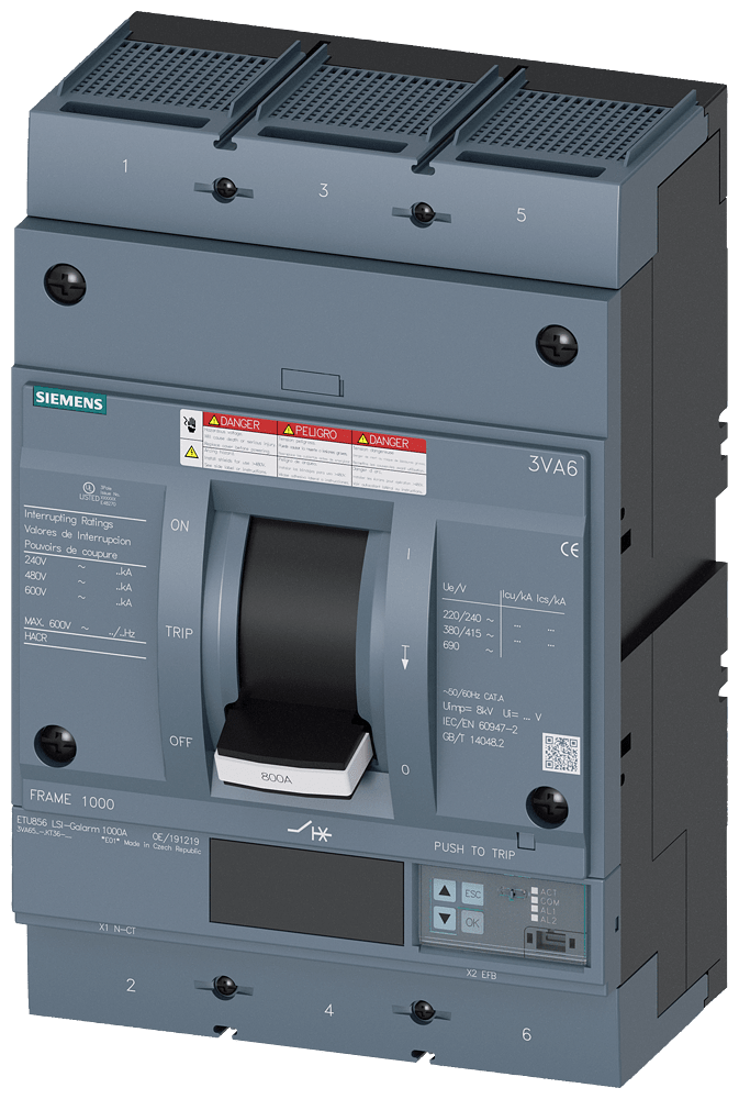 SIEMENS - Interruttore automatico 3VA6 UL Frame 800, classe del potere di interruzione C, 100 kA con 480 V a 3 poli 3VA65607KT362AA0