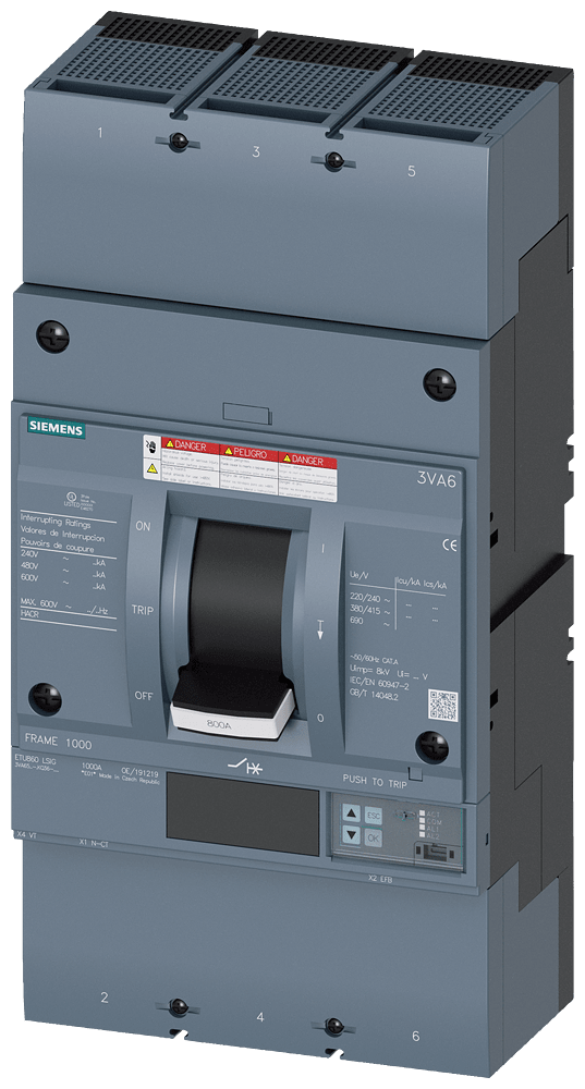 SIEMENS - Interruttore automatico 3VA6 UL Frame 800, classe del potere di interruzione H, 65 kA con 480 V a 3 poli