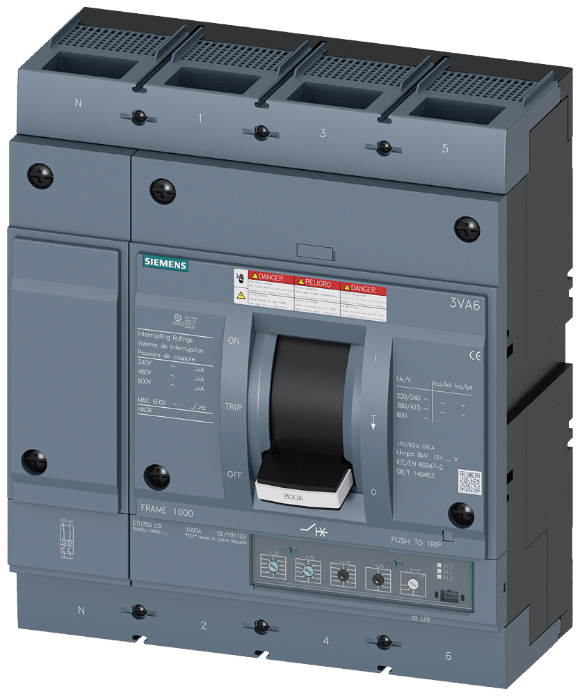 SIEMENS - Interruttore automatico 3VA6 UL Frame 800, classe del potere di interruzione H, 65 kA con 480 V a 4 poli 3VA65806HN420AA0