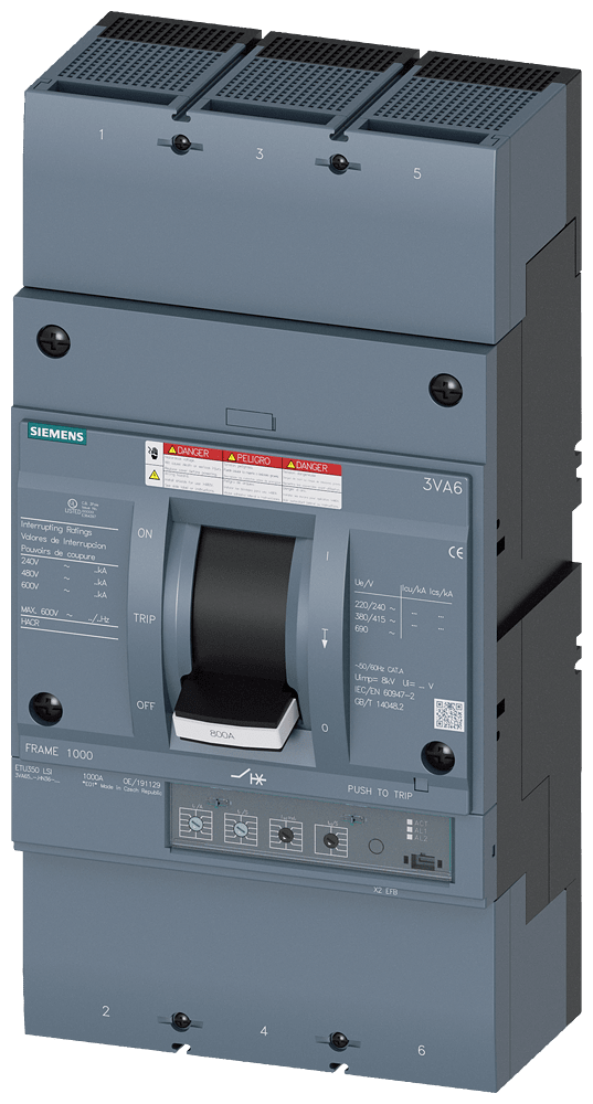 SIEMENS - Interruttore automatico 3VA6 UL Frame 800, classe del potere di interruzione M, 35 kA con 480 V a 3 poli