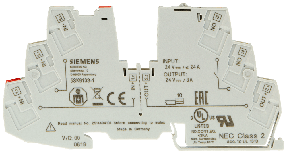 SIEMENS - Interruttore di protezione apparecchi elettronico, 1 A, DC 24 V, 1 blocchetto di contatti ausiliari 5SK91011