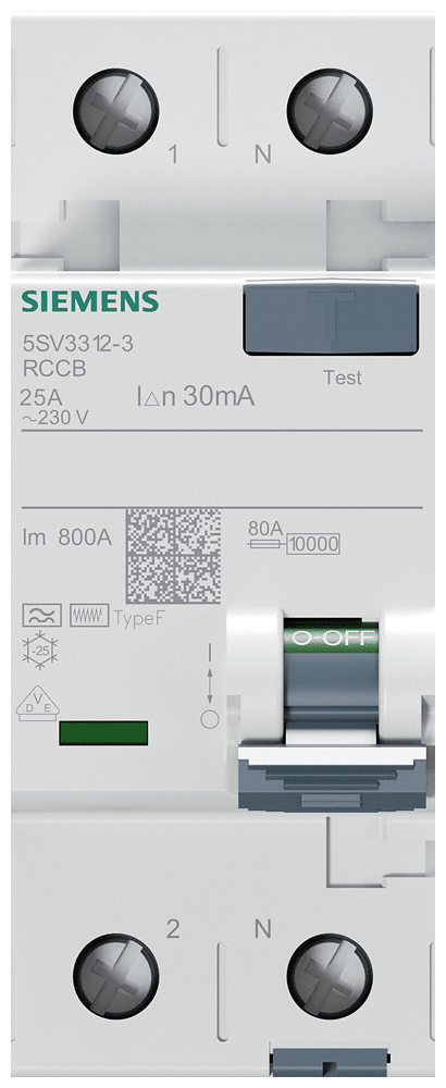 SIEMENS - Interruttore differenziale, a 2 poli, tipo F, con breve ritardo, In: 25 A, 30 mA 5SV33123