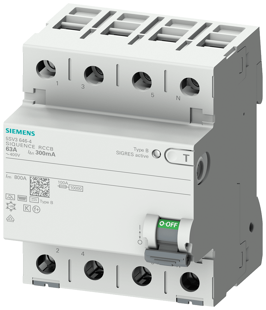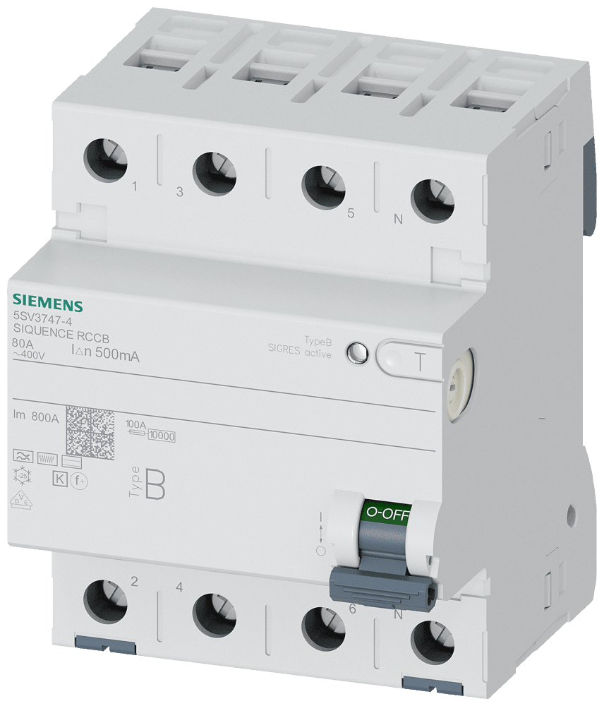SIEMENS - Interruttore differenziale, a 4 poli, tipo B, con breve ritardo, In: 80 A, 500 mA 5SV37474