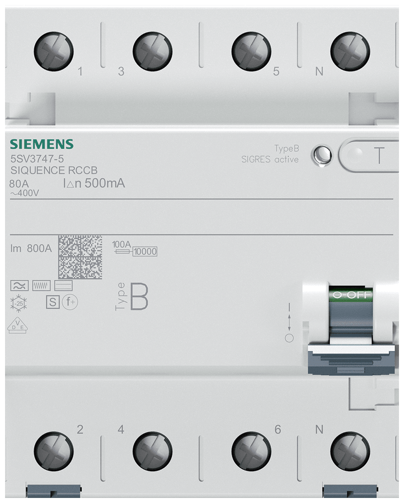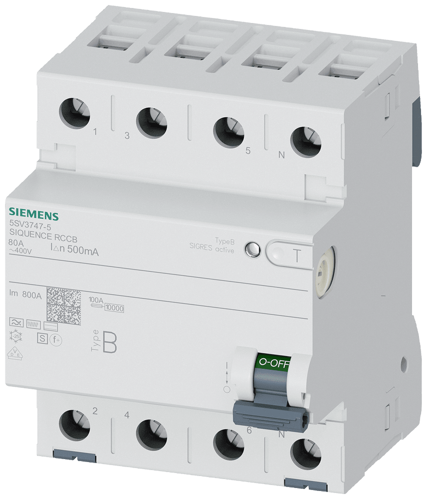 SIEMENS - Interruttore differenziale, a 4 poli, tipo B, selettivo, In: 80 A, 500 mA, Un AC: 400 V 5SV37475