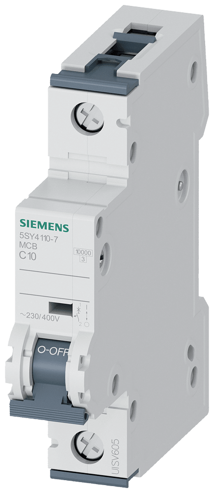 interruttore magnetotermico 230/400 V 10 kA, a 1 polo, C, 10A, P=70mm Interruttore magnetotermico SENTRON 5SY per la protezione da cortocircuito e sovraccarico sicura in edifici residenziali, funzionali e per applicazioni industriali specifiche. Montaggio e smontaggio dell'apparecchio senza attrezzi con l'ausilio di un cursore doppio. Combinazione qualsiasi di conduttori e sbarra collettrice grazie al morsetto a doppia camera. Semplice cablaggio dell'alimentazione mediante la sbarra collettrice posteriore. Gli interruttori magnetotermici 5SY sono disponibili in esecuzione a 1, 2, 3, 4 poli nonché a 1 polo +N e a 3 poli +N. Tutti gli accessori sono uniformemente utilizzabili per tutti gli interruttori magnetotermici 5SY. Semplicemente sicuri con gli apparecchi di protezione di SENTRON.