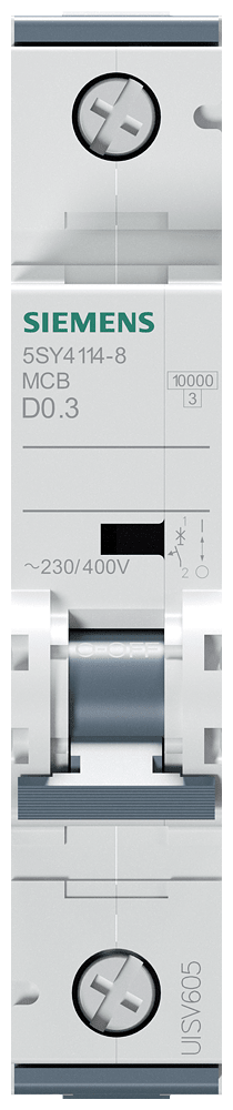 interruttore magnetotermico 230/400 V 10 kA, a 1 polo, D, 0,3 A, P=70mm Interruttore magnetotermico SENTRON 5SY per la protezione da cortocircuito e sovraccarico sicura in edifici residenziali, funzionali e per applicazioni industriali specifiche. Montaggio e smontaggio dell'apparecchio senza attrezzi con l'ausilio di un cursore doppio. Combinazione qualsiasi di conduttori e sbarra collettrice grazie al morsetto a doppia camera. Semplice cablaggio dell'alimentazione mediante la sbarra collettrice posteriore. Gli interruttori magnetotermici 5SY sono disponibili in esecuzione a 1, 2, 3, 4 poli nonché a 1 polo +N e a 3 poli +N. Tutti gli accessori sono uniformemente utilizzabili per tutti gli interruttori magnetotermici 5SY. Semplicemente sicuri con gli apparecchi di protezione di SENTRON.