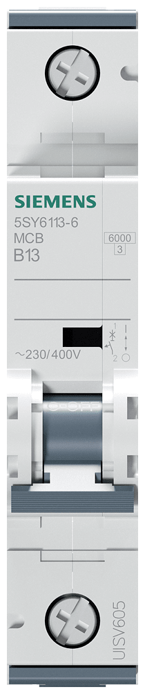 interruttore magnetotermico 230/400 V 6kA, a 1 polo, B, 13A, P=70mm Interruttore magnetotermico SENTRON 5SY per la protezione da cortocircuito e sovraccarico sicura in edifici residenziali, funzionali e per applicazioni industriali specifiche. Montaggio e smontaggio dell'apparecchio senza attrezzi con l'ausilio di un cursore doppio. Combinazione qualsiasi di conduttori e sbarra collettrice grazie al morsetto a doppia camera. Semplice cablaggio dell'alimentazione mediante la sbarra collettrice posteriore. Gli interruttori magnetotermici 5SY sono disponibili in esecuzione a 1, 2, 3, 4 poli nonché a 1 polo +N e a 3 poli +N. Tutti gli accessori sono uniformemente utilizzabili per tutti gli interruttori magnetotermici 5SY. Semplicemente sicuri con gli apparecchi di protezione di SENTRON.