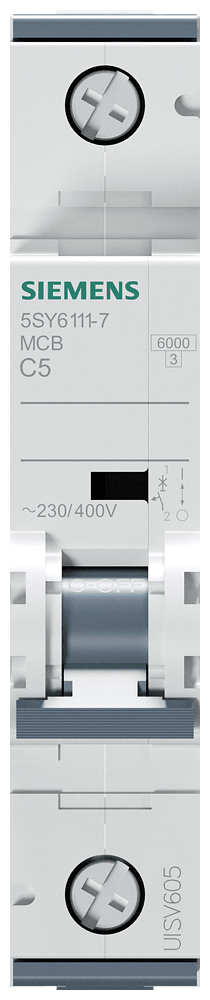 interruttore magnetotermico 230/400 V 6kA, a 1 polo, C, 5A Interruttore magnetotermico SENTRON 5SY per la protezione da cortocircuito e sovraccarico sicura in edifici residenziali, funzionali e per applicazioni industriali specifiche. Montaggio e smontaggio dell'apparecchio senza attrezzi con l'ausilio di un cursore doppio. Combinazione qualsiasi di conduttori e sbarra collettrice grazie al morsetto a doppia camera. Semplice cablaggio dell'alimentazione mediante la sbarra collettrice posteriore. Gli interruttori magnetotermici 5SY sono disponibili in esecuzione a 1, 2, 3, 4 poli nonché a 1 polo +N e a 3 poli +N. Tutti gli accessori sono uniformemente utilizzabili per tutti gli interruttori magnetotermici 5SY. Semplicemente sicuri con gli apparecchi di protezione di SENTRON.