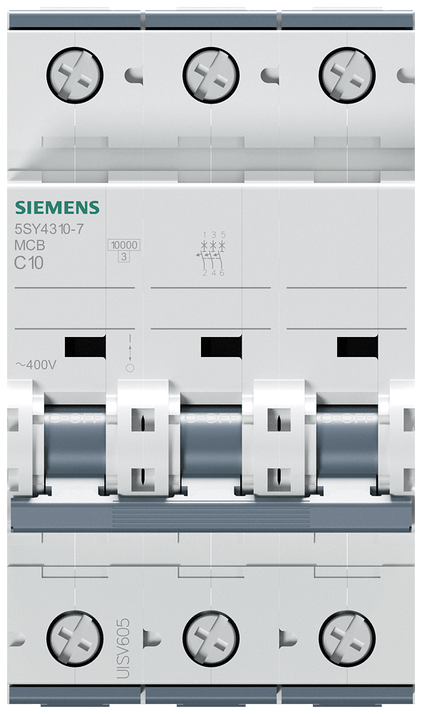 Interruttore magnetotermico 400V 10 kA, a 3 poli, C, 10A, P=70mm Interruttore magnetotermico SENTRON 5SY per la protezione da cortocircuito e sovraccarico sicura in edifici residenziali, funzionali e per applicazioni industriali specifiche. Montaggio e smontaggio dell'apparecchio senza attrezzi con l'ausilio di un cursore doppio. Combinazione qualsiasi di conduttori e sbarra collettrice grazie al morsetto a doppia camera. Semplice cablaggio dell'alimentazione mediante la sbarra collettrice posteriore. Gli interruttori magnetotermici 5SY sono disponibili in esecuzione a 1, 2, 3, 4 poli nonché a 1 polo +N e a 3 poli +N. Tutti gli accessori sono uniformemente utilizzabili per tutti gli interruttori magnetotermici 5SY. Semplicemente sicuri con gli apparecchi di protezione di SENTRON.