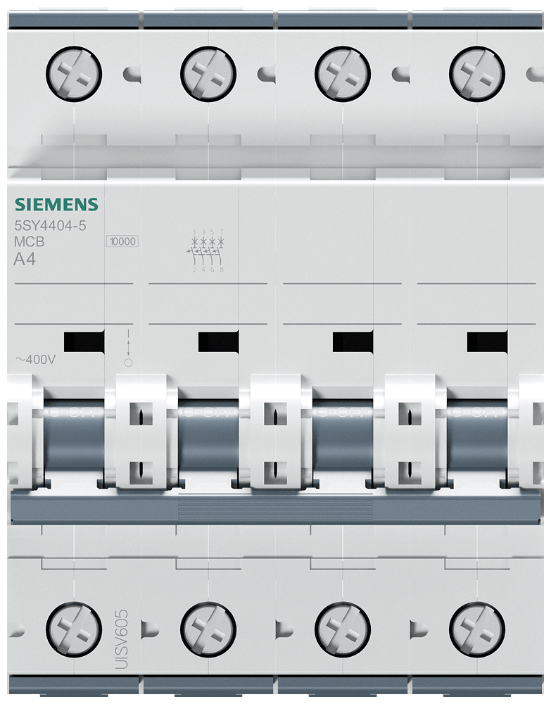 Interruttore magnetotermico 400V 10 kA, a 4 poli, A, 4A, P=70mm Interruttore magnetotermico SENTRON 5SY per la protezione da cortocircuito e sovraccarico sicura in edifici residenziali, funzionali e per applicazioni industriali specifiche. Montaggio e smontaggio dell'apparecchio senza attrezzi con l'ausilio di un cursore doppio. Combinazione qualsiasi di conduttori e sbarra collettrice grazie al morsetto a doppia camera. Semplice cablaggio dell'alimentazione mediante la sbarra collettrice posteriore. Gli interruttori magnetotermici 5SY sono disponibili in esecuzione a 1, 2, 3, 4 poli nonché a 1 polo +N e a 3 poli +N. Tutti gli accessori sono uniformemente utilizzabili per tutti gli interruttori magnetotermici 5SY. Semplicemente sicuri con gli apparecchi di protezione di SENTRON.
