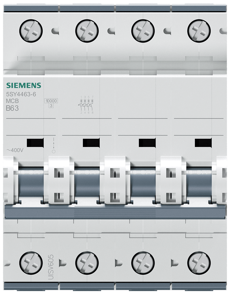 Interruttore magnetotermico 400V 10 kA, a 4 poli, B, 63A, P=70mm Interruttore magnetotermico SENTRON 5SY per la protezione da cortocircuito e sovraccarico sicura in edifici residenziali, funzionali e per applicazioni industriali specifiche. Montaggio e smontaggio dell'apparecchio senza attrezzi con l'ausilio di un cursore doppio. Combinazione qualsiasi di conduttori e sbarra collettrice grazie al morsetto a doppia camera. Semplice cablaggio dell'alimentazione mediante la sbarra collettrice posteriore. Gli interruttori magnetotermici 5SY sono disponibili in esecuzione a 1, 2, 3, 4 poli nonché a 1 polo +N e a 3 poli +N. Tutti gli accessori sono uniformemente utilizzabili per tutti gli interruttori magnetotermici 5SY. Semplicemente sicuri con gli apparecchi di protezione di SENTRON.