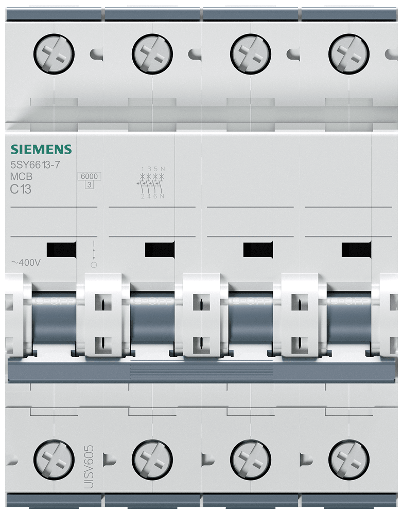 Interruttore magnetotermico 400V 6kA, a 3+N poli C, 13A, P=70mm Interruttore magnetotermico SENTRON 5SY per la protezione da cortocircuito e sovraccarico sicura in edifici residenziali, funzionali e per applicazioni industriali specifiche. Montaggio e smontaggio dell'apparecchio senza attrezzi con l'ausilio di un cursore doppio. Combinazione qualsiasi di conduttori e sbarra collettrice grazie al morsetto a doppia camera. Semplice cablaggio dell'alimentazione mediante la sbarra collettrice posteriore. Gli interruttori magnetotermici 5SY sono disponibili in esecuzione a 1, 2, 3, 4 poli nonché a 1 polo +N e a 3 poli +N. Tutti gli accessori sono uniformemente utilizzabili per tutti gli interruttori magnetotermici 5SY. Semplicemente sicuri con gli apparecchi di protezione di SENTRON.