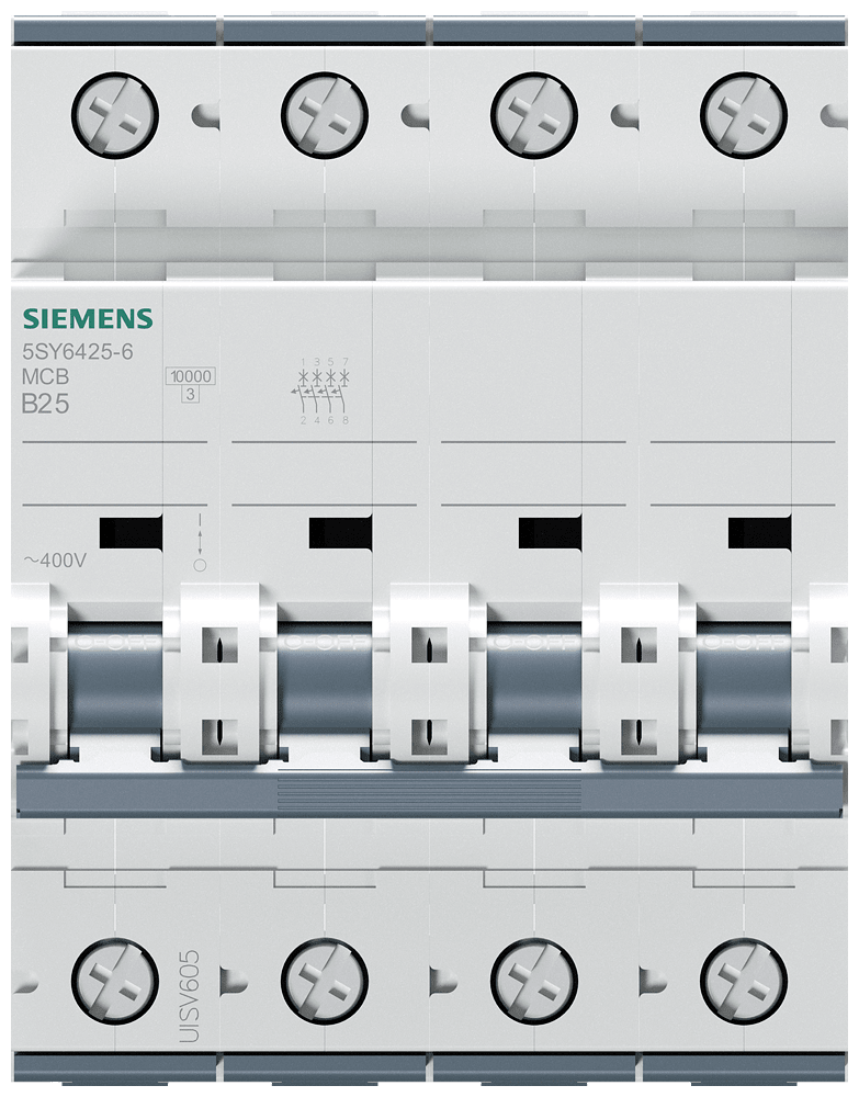 Interruttore magnetotermico 400V 6kA, a 4 poli, B, 25A, P=70mm Interruttore magnetotermico SENTRON 5SY per la protezione da cortocircuito e sovraccarico sicura in edifici residenziali, funzionali e per applicazioni industriali specifiche. Montaggio e smontaggio dell'apparecchio senza attrezzi con l'ausilio di un cursore doppio. Combinazione qualsiasi di conduttori e sbarra collettrice grazie al morsetto a doppia camera. Semplice cablaggio dell'alimentazione mediante la sbarra collettrice posteriore. Gli interruttori magnetotermici 5SY sono disponibili in esecuzione a 1, 2, 3, 4 poli nonché a 1 polo +N e a 3 poli +N. Tutti gli accessori sono uniformemente utilizzabili per tutti gli interruttori magnetotermici 5SY. Semplicemente sicuri con gli apparecchi di protezione di SENTRON.