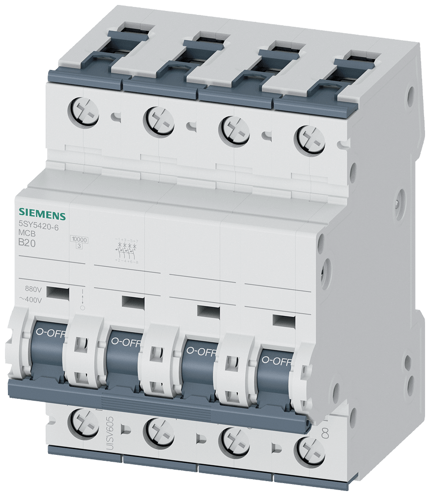 SIEMENS - Interruttore magnetotermico corrente universale DC 880 V AC 400 V 10 kA, a 4 poli, B, 20 A 5SY54206
