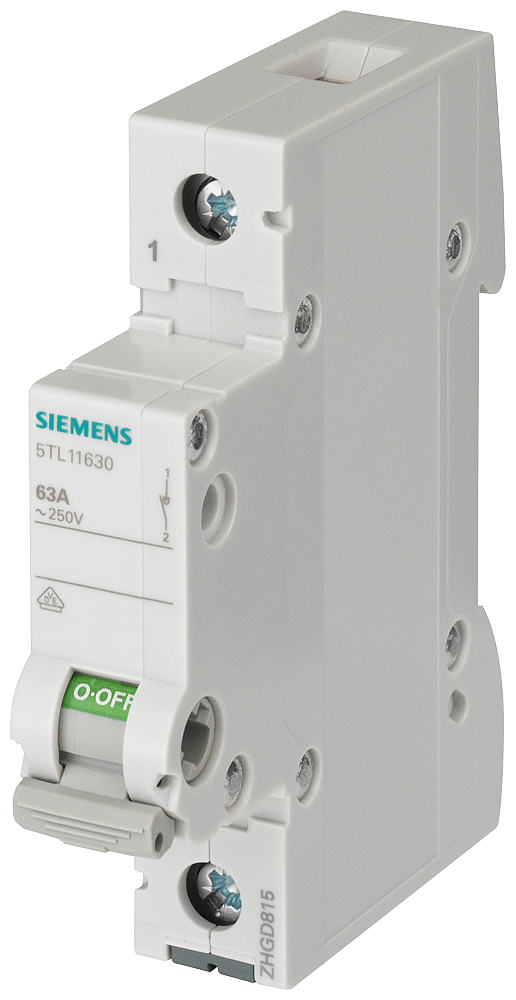 sezionatore sottocarico, interruttore ON/OFF 63 A a 1 polo Interruttori ON/OFF per montaggio su guida DIN per il comando di impianti elettrici. Gli Interruttori ON/OFF 5TL1 sono impiegati per il comando di luci, motori ed altre apparecchiature elettriche. Le correnti nominali vanno a 32 A a 125 A. Le varianti di apparecchio 5TL1 sono impiegabili inoltre come sezionatori sottocarico secondo EN 60947-1. Gli apparecchi possono essere utilizzati secondo EN 60204-1 come interruttori principali per il sezionamento o la messa fuori tensione di impianti. Sia che si trattidi esigenze applicative nell'infrastruttura o nell'industria - Siemens offre apparecchi d manovra magnetotermici per qualsiasi campo d'impiego. Grazie al nuovo design l'interruttore ON/OF 5TL1 può essere perfettamente integrato dal punto di vista ottico nella serie degli interruttori differenziali e degli interruttori magnetotermici. Gli apparecchi di manovra di Siemens si contraddistinguono soprattutto per le seguenti caratteristiche: 1 Elevata sicurezza di funzionamento e disponibilità degli impianti grazie all'inserzione e alla disinserzione separata del circuito interessato. 2. Sicurezza affidabile durante l'installazione grazie alla protezione avvolgente e alla protezione contro i contatti accidentali come standard di serie. 3. Rimozione senza attrezzi dalla guida o dalla struttura di sbarre collettrici grazie al comodo cursore di sgancio manuale. 4. Indicazione della posizione di commutazione chiaramente visibile. 5. Possibilità d'impiego come sezionatore sottocarico e interruttore principale. 6. Gli interruttori ON e OFF sono conformi alle norme EN 60947-1 e EN 60204-1. 7. Tecnica ottimale per la vostra sicurezza - solo da Siemens.