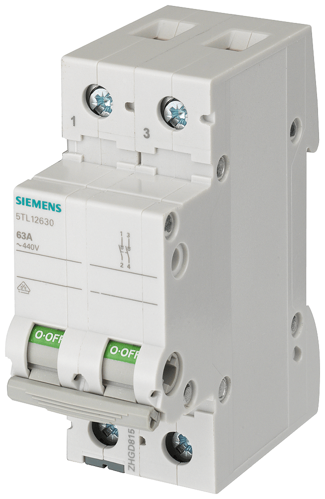 sezionatore sottocarico, interruttore ON/OFF 63 A a 2 poli Interruttori ON/OFF per montaggio su guida DIN per il comando di impianti elettrici. Gli Interruttori ON/OFF 5TL1 sono impiegati per il comando di luci, motori ed altre apparecchiature elettriche. Le correnti nominali vanno a 32 A a 125 A. Le varianti di apparecchio 5TL1 sono impiegabili inoltre come sezionatori sottocarico secondo EN 60947-1. Gli apparecchi possono essere utilizzati secondo EN 60204-1 come interruttori principali per il sezionamento o la messa fuori tensione di impianti. Sia che si trattidi esigenze applicative nell'infrastruttura o nell'industria - Siemens offre apparecchi d manovra magnetotermici per qualsiasi campo d'impiego. Grazie al nuovo design l'interruttore ON/OF 5TL1 può essere perfettamente integrato dal punto di vista ottico nella serie degli interruttori differenziali e degli interruttori magnetotermici. Gli apparecchi di manovra di Siemens si contraddistinguono soprattutto per le seguenti caratteristiche: 1 Elevata sicurezza di funzionamento e disponibilità degli impianti grazie all'inserzione e alla disinserzione separata del circuito interessato. 2. Sicurezza affidabile durante l'installazione grazie alla protezione avvolgente e alla protezione contro i contatti accidentali come standard di serie. 3. Rimozione senza attrezzi dalla guida o dalla struttura di sbarre collettrici grazie al comodo cursore di sgancio manuale. 4. Indicazione della posizione di commutazione chiaramente visibile. 5. Possibilità d'impiego come sezionatore sottocarico e interruttore principale. 6. Gli interruttori ON e OFF sono conformi alle norme EN 60947-1 e EN 60204-1. 7. Tecnica ottimale per la vostra sicurezza - solo da Siemens.