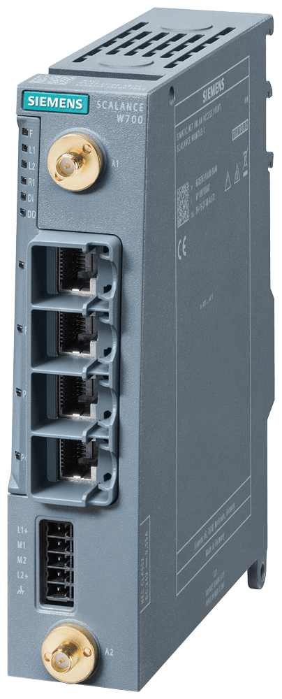 IWLAN Client, SCALANCE WUM763-1, 1 interfaccia radio, 2,4/5 GHz 2 collegamenti R-SMA, supporto iFeature via CLP, IEEE 802.11ax (Wi-Fi 6), 1201 Mbit/s (lordo), 4x porte RJ45 da 10/100/1000 Mbit/s, DC 24 V ridondante, blocco morsetti, IP30, -30 ... +60 °C, slot per CLP, osservare le omologazioni nazionali! ID-Cert: MSAX-W1-RJ-E2-NO FCC ID: LYHMSAXV1 funzionamento al di fuori di USA/Israele dotazione di fornitura: copertura posto connettore CLP, coperture collegamenti d'antenna, 1x morsettiera SCALANCE WUM763-1 1xRadio, connettore antenna 2xR-SMA, supporto iFeatures tramite CLP, IEEE 802.11ax (Wi-Fi 6), 2,4/5 GHz, velocità di trasmissione dati lorda 1201 Mbit/s, 4x10/100/1000 Mbit/s porta RJ45, DC ridondante 24 V, morsettiera, IP30, slot CLP, per il funzionamento al di fuori di USA/Israele. Per gestire la connessione wireless con funzionalità specificamente progettate per l'industria (PCF/PCF-MC) da un dispositivo collegato con una connessione Industrial Ethernet. 1 pezzo.I dispositivi sono adatti per l'installazione nel quadro elettrico e per l'installazione all'interno senza quadro elettrico. Con l'aiuto di funzioni sviluppate appositamente per l'industria, è possibile una comunicazione wireless sicura tramite PROFINET con PROFIsafe fino a 150 Mbit/s. Integrazione di sistemi industriali nelle infrastrutture WLAN, sostituzione economica dei percorsi dei cavi, design leggero e piccolo per un uso efficiente su veicoli a guida automatica (AGV). Compatto e poco ingombrante nel quadro elettrico. Particolarmente a prova di futuro grazie alla conformità allo standard Wi-Fi IEEE 802.11 riconosciuto a livello mondiale. Traffico dati prevedibile (deterministica) e tempi di risposta definiti sul collegamento radio. Comunicazione PROFINET per requisiti di ridondanza e in tempo reale e trasmissione di dati rilevanti per la sicurezza tramite PROFIsafe. Facile gestione tramite web server e SNMP. L'ampia gamma di accessori comprende un'ampia gamma di antenne, connettori, utensili di spelatura, accessori di montaggio e tecnologia di cablaggio che completano il sistema.