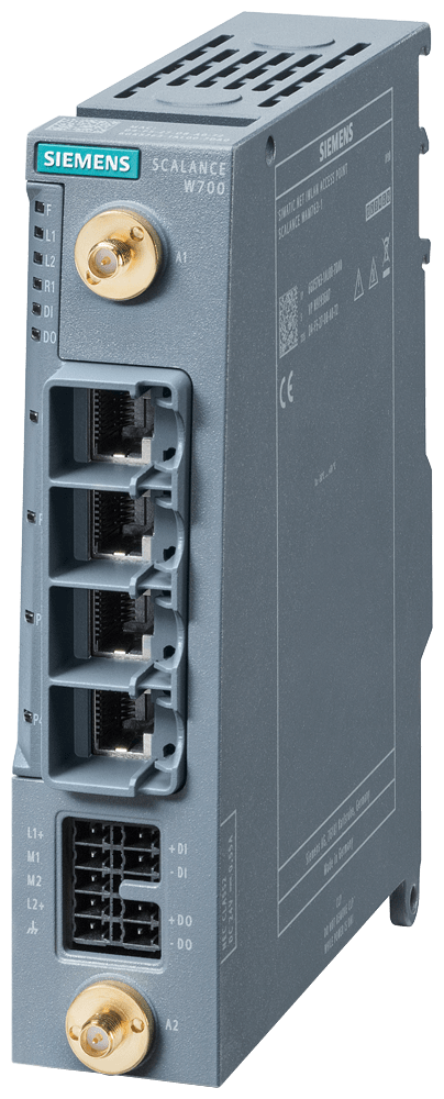 IWLAN Client, SCALANCE WUM763-1, 1 interfaccia radio, 2,4/5 GHz 2 collegamenti R-SMA, supporto iFeature via CLP, IEEE 802.11ax (Wi-Fi 6), 1201 Mbit/s (lordo), 4x porte RJ45 da 10/100/1000 Mbit/s, DC 24 V ridondante, blocco morsetti, IP30, -30 ... +60 °C, slot per CLP, osservare le omologazioni nazionali! ID-Cert: MSAX-W1-RJ-E2-NO FCC ID: LYHMSAXV1 per il funzionamento negli USA dotazione di fornitura: copertura posto connettore CLP, coperture collegamenti d'antenna, 1x blocco morsetti SCALANCE WUM763-1 1xRadio, connettore antenna 2xR-SMA, supporto iFeatures tramite CLP, IEEE 802.11ax (Wi-Fi 6), 2,4/5 GHz, velocità di trasmissione dati lorda 1201 Mbit/s, 4x10/100/1000 Mbit/s porta RJ45, DC ridondante 24 V, morsettiera, IP30, slot CLP, per il funzionamento al di fuori di USA/Israele. Per gestire la connessione wireless con funzionalità specificamente progettate per l'industria (PCF/PCF-MC) da un dispositivo collegato con una connessione Industrial Ethernet. 1 pezzo.I dispositivi sono adatti per l'installazione nel quadro elettrico e per l'installazione all'interno senza quadro elettrico. Con l'aiuto di funzioni sviluppate appositamente per l'industria, è possibile una comunicazione wireless sicura tramite PROFINET con PROFIsafe fino a 150 Mbit/s. Integrazione di sistemi industriali nelle infrastrutture WLAN, sostituzione economica dei percorsi dei cavi, design leggero e piccolo per un uso efficiente su veicoli a guida automatica (AGV). Compatto e poco ingombrante nel quadro elettrico. Particolarmente a prova di futuro grazie alla conformità allo standard Wi-Fi IEEE 802.11 riconosciuto a livello mondiale. Traffico dati prevedibile (deterministica) e tempi di risposta definiti sul collegamento radio. Comunicazione PROFINET per requisiti di ridondanza e in tempo reale e trasmissione di dati rilevanti per la sicurezza tramite PROFIsafe. Facile gestione tramite web server e SNMP. L'ampia gamma di accessori comprende un'ampia gamma di antenne, connettori, utensili di spelatura, accessori di montaggio e tecnologia di cablaggio che completano il sistema.