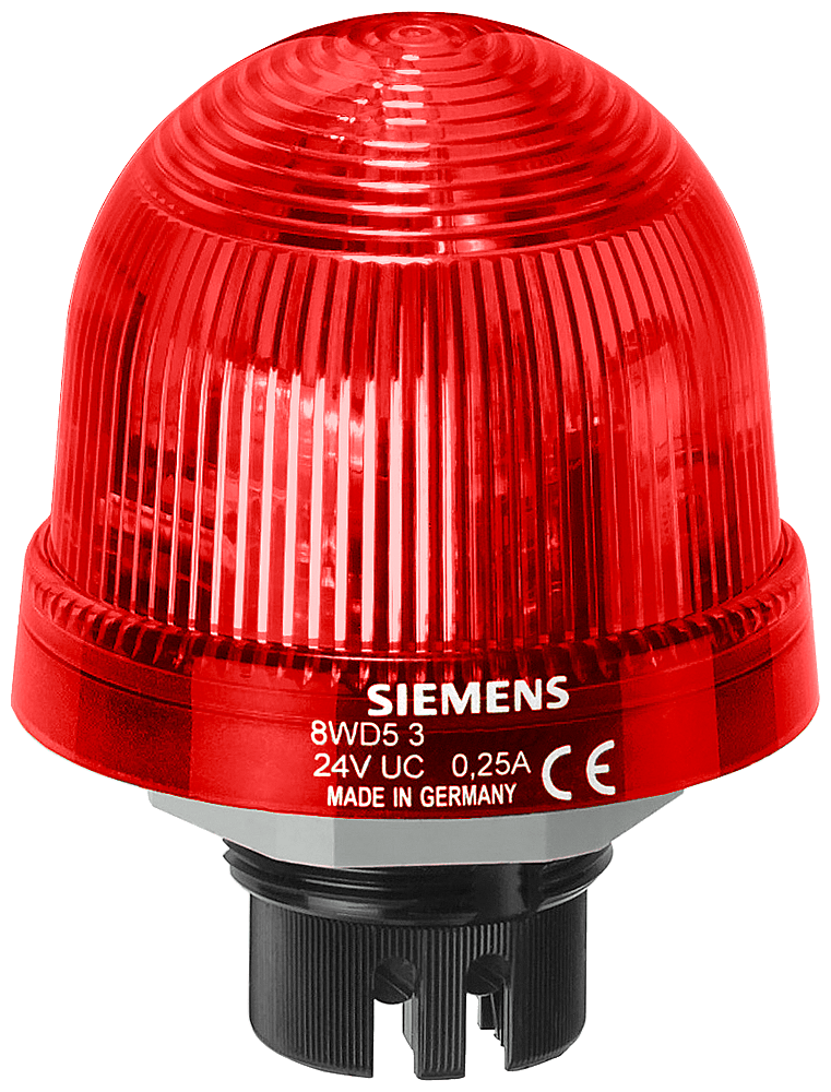 luce flash di segnalazione, con elettronica flash integrata, rosso, DC 24 V, diametro 70 mm Luce flash SIRIUS 8WD5 incl. elemento luminoso per la segnalazione visiva in condizioni ambientali gravose e in impianti in ambiente esterno, ad es. per la sorveglianza ottica dello stato di funzionamento in impianti di produzione. Le luci di segnalazione sono estremamente resistenti a urti e vibrazioni. La loro forma speciale consente un'emissione luminosa ottimale di lato e verso l'alto. Oltre che per luce continua sono disponibili lampade per luce lampeggiante, luce rotante e luce flash in diversi colori e per diverse tensioni. Come accessori sono fornibili piedi, adattatori, lampade a incandescenza, LED e adattatori stelo. Colonnine di segnalazione SIRIUS 8WD - Modulari e con funzionalità di comunicazione.