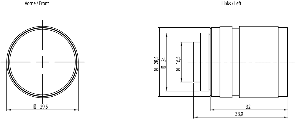mini-obiettivo 25 mm, 1: 1,4 con distanza focale fissa, apertura diaframma e fuoco regolabile D=29,5mm, L=38,9mm .