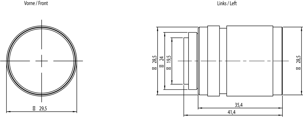 mini-obiettivo 35 mm, 1: 1,6 con distanza focale fissa, apertura diaframma e fuoco regolabile D=29,5mm, L=41,4mm .