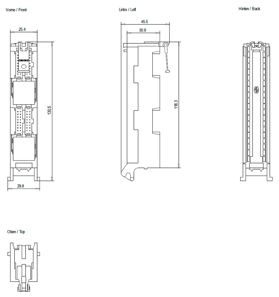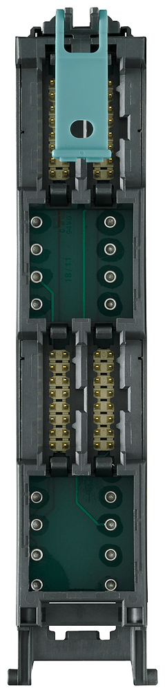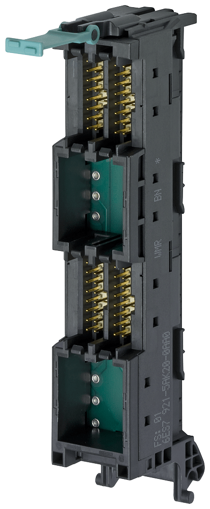 modulo connettore frontale con 4 x 16 poli connessione IDC per analogiche unità I/O dell'S7-1500 a 40 poli alimentazione di potenziale tramite elemento di alimentazione Il modulo connettore frontale per SIMATIC S7-1500 per il collegamento di cavi a 16 poli è un connettore frontale modificato per il collegamento ad una unità I/O analogica. Questo viene innestato sull'unità da cablare al posto del connettore frontale. Qui vengono innestati l'elemento di alimentazione ed i cavi di collegamento e quindi collegati con il modulo di connessione. Questo modulo connettore frontale modificato è parte integrante del collegamento completamente modulare di SIMATIC TOP connect per il cablaggio di sistema più rapido e più sicuro. Oltre ad un ridotto onere di cablaggio è possibile una riduzione significativa delle fonti di errori. I segnali analogici della periferia vengono addotti ai moduli di connessione di SIMATIC TOP connect e da questi, tramite cavo di collegamento e modulo connettore frontale, collegati con il SIMATIC S7-1500.