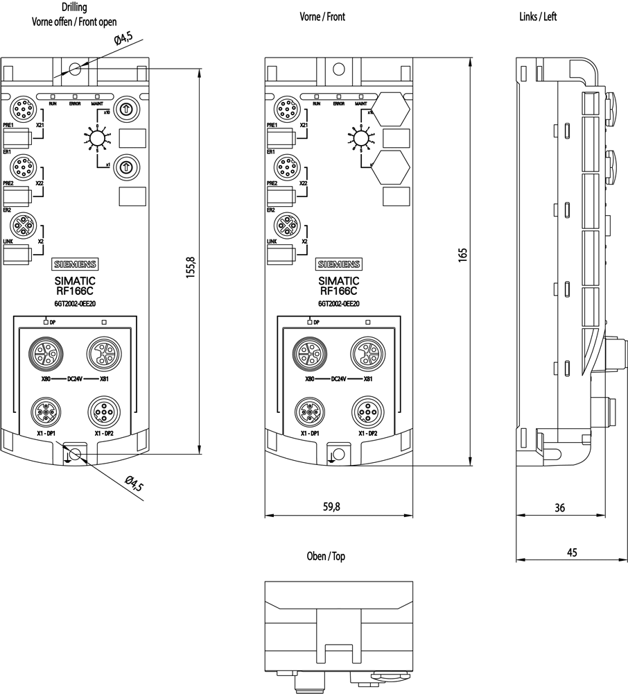 RFID Communication Module RF166C per PROFIBUS DP V1, Ethernet per WBM e OPC UA, 2 reader collegabili. SIMATIC RFmodulo di comunicazione RF166C