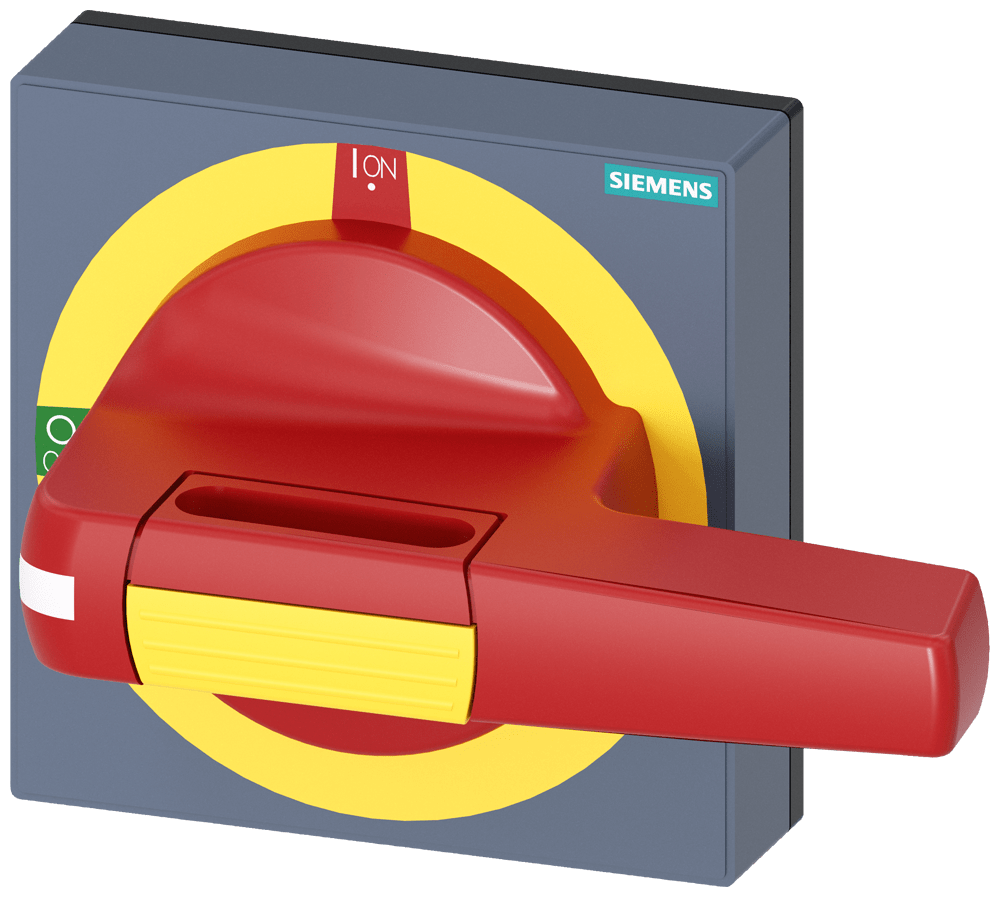manopola con mostrina frontale emergenza dimensioni 100 x 100, per albero 8 x 8, Test-0-I operatore grandezza 100mm accessori per 3KD grand. costr. 3, 3KF grand. costr. 2 e 3 Comandi manuali per un comodo utilizzo dell'interruttore automatico scatolato 3VA. Disponibilità come comando rotativo frontale, per porta e parete laterale con diverse possibilità di chiusura a chiave e con interblocco Le manopole sono disponibili nelle varianti standard e ARRESTO DI EMERGENZA, ciascuna con o senza kit di illuminazione. Interruttori automatici scatolati SENTRON 3VA - Un sistema. Per tutte le applicazioni.