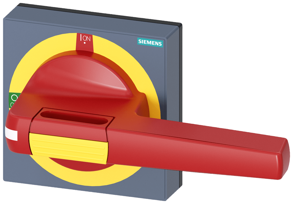 manopola con mostrina frontale emergenza dimensioni 100 x 100, per albero 10x 10, 0-I, operatore grandezza 140mm accessori per 3KD grand. costr. 4, 3KF grand. costr. 4 Comandi manuali per un comodo utilizzo dell'interruttore automatico scatolato 3VA. Disponibilità come comando rotativo frontale, per porta e parete laterale con diverse possibilità di chiusura a chiave e con interblocco Le manopole sono disponibili nelle varianti standard e ARRESTO DI EMERGENZA, ciascuna con o senza kit di illuminazione. Interruttori automatici scatolati SENTRON 3VA - Un sistema. Per tutte le applicazioni.