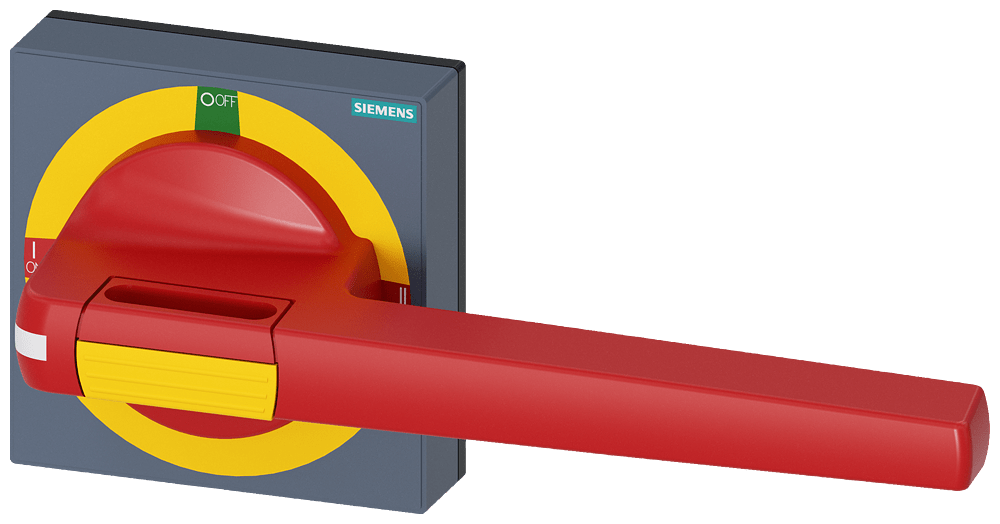 manopola con mostrina frontale emergenza dimensioni 100 x 100, per albero 12x 12, I-0-II, operatore grandezza 200mm accessori per 3KC0 grand. costr. 5 Comandi manuali per un comodo utilizzo dell'interruttore automatico scatolato 3VA. Disponibilità come comando rotativo frontale, per porta e parete laterale con diverse possibilità di chiusura a chiave e con interblocco Le manopole sono disponibili nelle varianti standard e ARRESTO DI EMERGENZA, ciascuna con o senza kit di illuminazione. Interruttori automatici scatolati SENTRON 3VA - Un sistema. Per tutte le applicazioni.