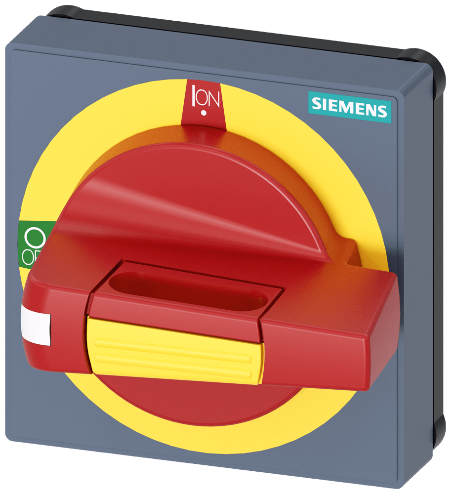 operatore con mostrina frontale ARRESTO DI EMERGENZA dimensioni 75x 75, per albero 6x 6 e 8x 8, 0-I, operatore grandezza 45mm accessori per 3KD grand. costr. 1 e 2, 3KF grand. costr. 1, 3LD5 UL Comandi manuali per un comodo utilizzo dell'interruttore automatico scatolato 3VA. Disponibilità come comando rotativo frontale, per porta e parete laterale con diverse possibilità di chiusura a chiave e con interblocco Le manopole sono disponibili nelle varianti standard e ARRESTO DI EMERGENZA, ciascuna con o senza kit di illuminazione. Interruttori automatici scatolati SENTRON 3VA - Un sistema. Per tutte le applicazioni.