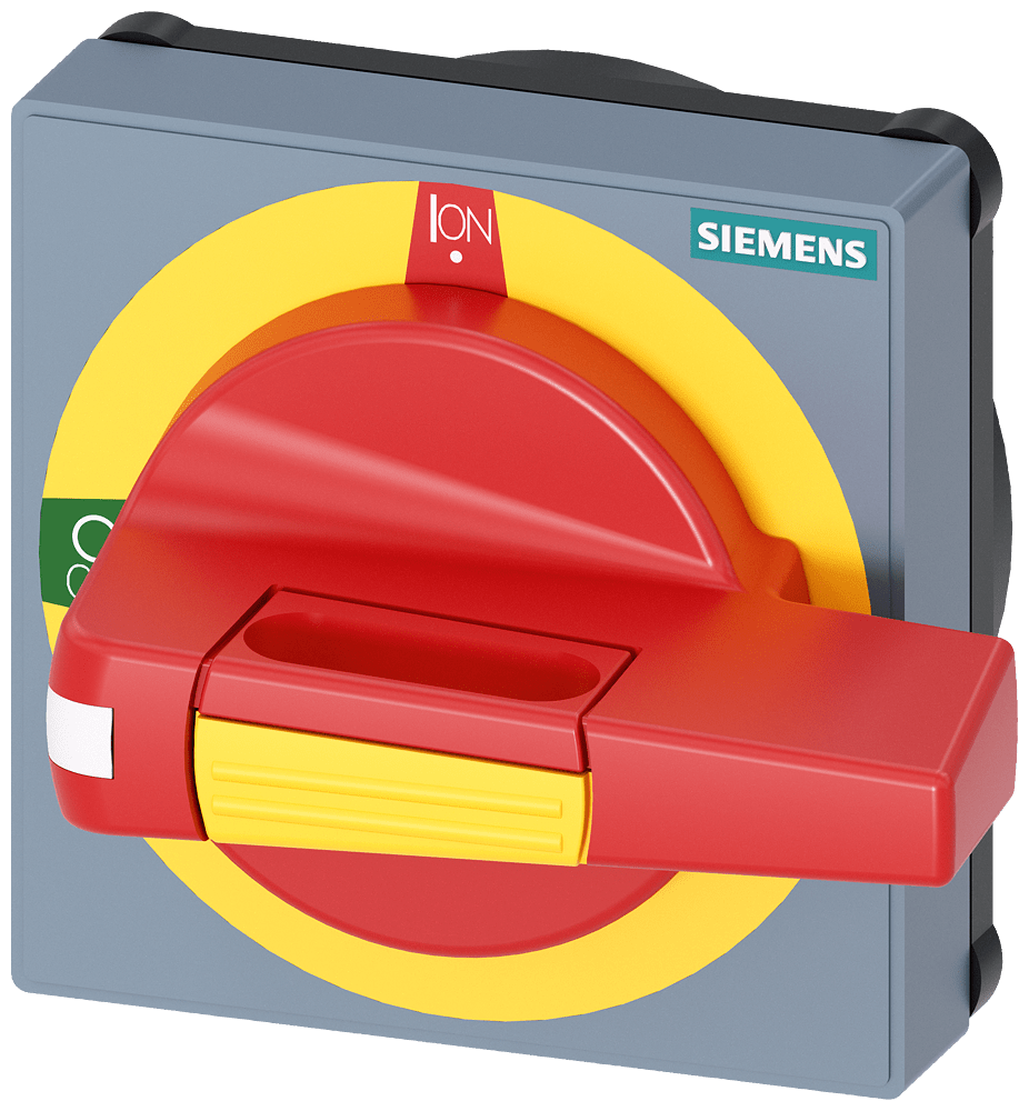 operatore con mostrina frontale ARRESTO DI EMERGENZA dimensioni 75x 75, per albero 8x 8, 0-I, operatore grandezza 55mm, 3LD5 UL Comandi manuali per un comodo utilizzo dell'interruttore automatico scatolato 3VA. Disponibilità come comando rotativo frontale, per porta e parete laterale con diverse possibilità di chiusura a chiave e con interblocco Le manopole sono disponibili nelle varianti standard e ARRESTO DI EMERGENZA, ciascuna con o senza kit di illuminazione. Interruttori automatici scatolati SENTRON 3VA - Un sistema. Per tutte le applicazioni.