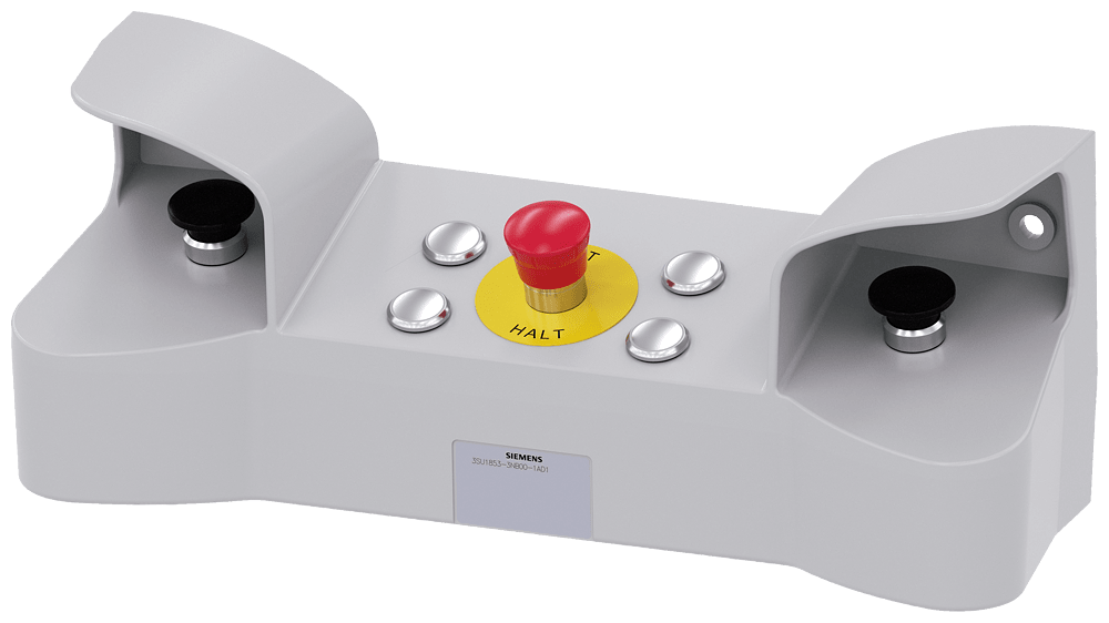 pulpito di comando a due mani per dispositivi di comando, 22 mm, rotondo, materiale della pulsantiera metallo, parte superiore della pulsantiera grigia, 3 punti di comando in metallo, 4 fori aggiuntivi per dispositivi di comando da 22 mm 2 pulsanti a fungo neri 40mm, 2x 1NO+1NC, attacco a vite, 1 arresto di emergenza rosso, 40 mm, 2NC, attacco a vite, fissaggio frontale, 4x tappo cieco in metallo, con passacavi per pressacavi metrici Pulpito di comando bimanuale SIRIUS ACT per macchine e impianti con potenziale di pericolo più alto (ad es. per una sicurezza elevata di presse, punzonatrici) secondo EN 574. Siemens offre, sotto il nome commerciale SIRIUS ACT, un portfolio esclusivo di dispositivi di comando e segnalazione con omologazioni di prodotto per il mercato mondiale in tre moderne serie di design in robusto metallo puro e plastica pregiata.L'innovativo concetto di innesto a scatto semplifica talmente il montaggio che per eseguirlo basta una sola mano e non servono attrezzi speciali. Per i fori di montaggio sono sufficienti semplici fori non scanalati, essendo già integrata una protezione antirotazione al 100 %.Grazie al grado di protezione elevato i robusti apparecchi sono adatti all'impiego industriale e in ambiente esterno. È persino possibile la pulizia con getto ad alta pressione. Né polvere, né oli, né liscivia possono comprometterne il funzionamento affidabile.Oltre che con il cablaggio standard, gli apparecchi possono essere collegati al controllore anche tramite PROFINET, AS-Interface oppure IO-Link. Potete così ridurre il vostro onere di cablaggio, minimizzare le fonti di errore e ottenere maggiore flessibilità.Il configuratore online grafico supporta in modo confortevole la scelta e l'ordinazione di singoli apparecchi, pulsantiere e iscrizioni. È disponibile una documentazione completa (ad es. manuale, dati 3D, schema di collegamento). Esecuzioni fornibili: plastica/metallo, pulsantiera equipaggiabile/equipaggiata. SIRIUS ACT - Performance in Action nel comando e nella segnalazione. Semplici da montare, altamente performanti, semplicemente perfetti.