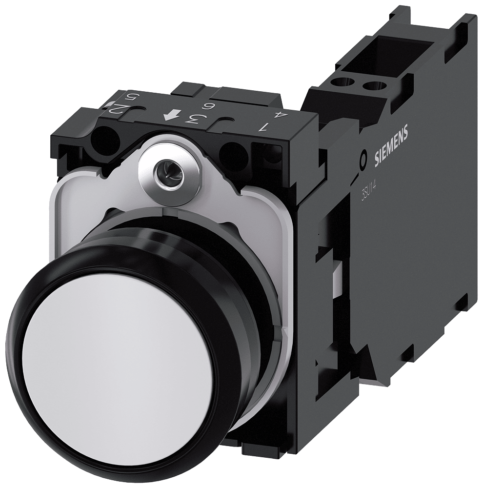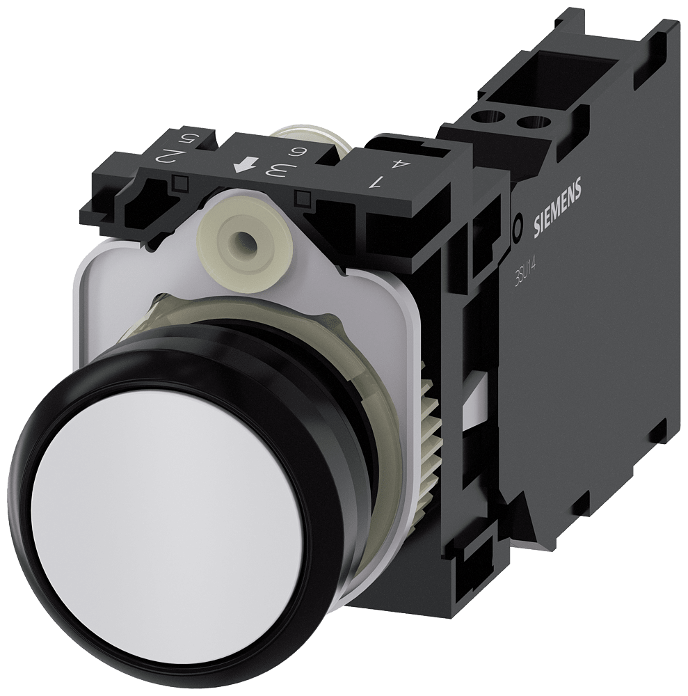 pulsante, 22 mm, rotondo, in plastica, bianco, bottone, piatto, ad impulso, con supporto 1 NO+1 NC, morsetti a molla, Pulsante SIRIUS ACT per la commutazione e il comando di utilizzatori elettrici. Siemens offre, sotto il nome commerciale SIRIUS ACT, un portfolio esclusivo di dispositivi di comando e segnalazione con omologazioni di prodotto per il mercato mondiale in tre moderne serie di design in robusto metallo puro e plastica pregiata.L'innovativo concetto di innesto a scatto semplifica talmente il montaggio che per eseguirlo basta una sola mano e non servono attrezzi speciali. Per i fori di montaggio sono sufficienti semplici fori non scanalati, essendo già integrata una protezione antirotazione al 100 %.Grazie al grado di protezione elevato i robusti apparecchi sono adatti all'impiego industriale e in ambiente esterno. È persino possibile la pulizia con getto ad alta pressione. Né polvere, né oli, né liscivia possono comprometterne il funzionamento affidabile.Oltre che con il cablaggio standard, gli apparecchi possono essere collegati al controllore anche tramite PROFINET, AS-Interface oppure IO-Link. Potete così ridurre il vostro onere di cablaggio, minimizzare le fonti di errore e ottenere maggiore flessibilità.Il configuratore online grafico supporta in modo confortevole la scelta e l'ordinazione di singoli apparecchi, pulsantiere e iscrizioni. È disponibile una documentazione completa (ad es. manuale, dati 3D, schema di collegamento). Esecuzioni fornibili: più colori, luminoso/non luminoso, con/senza iscrizione, comando permanente/ad impulso, diverse altezze di bottone e ghiera. Avvertenza: Apparecchio completo, fornitura incl. supporto e moduli. SIRIUS ACT - Performance in Action nel comando e nella segnalazione. Semplici da montare, altamente performanti, semplicemente perfetti.