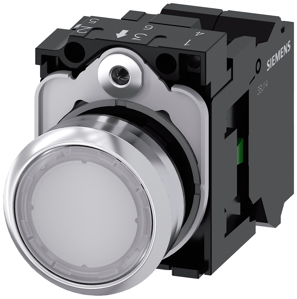 pulsante luminoso, 22 mm, rotondo, in metallo, lucido, bianco, bottone, piatto, ad impulso, con supporto, 1 NO, modulo LED con LED integrato AC/DC 24V, morsetto a molla Pulsanti luminosi SIRIUS ACT per la commutazione e il comando di utilizzatori elettrici. Siemens offre, sotto il nome commerciale SIRIUS ACT, un portfolio esclusivo di dispositivi di comando e segnalazione con omologazioni di prodotto per il mercato mondiale in tre moderne serie di design in robusto metallo puro e plastica pregiata.L'innovativo concetto di innesto a scatto semplifica talmente il montaggio che per eseguirlo basta una sola mano e non servono attrezzi speciali. Per i fori di montaggio sono sufficienti semplici fori non scanalati, essendo già integrata una protezione antirotazione al 100 %.Grazie al grado di protezione elevato i robusti apparecchi sono adatti all'impiego industriale e in ambiente esterno. È persino possibile la pulizia con getto ad alta pressione. Né polvere, né oli, né liscivia possono comprometterne il funzionamento affidabile.Oltre che con il cablaggio standard, gli apparecchi possono essere collegati al controllore anche tramite PROFINET, AS-Interface oppure IO-Link. Potete così ridurre il vostro onere di cablaggio, minimizzare le fonti di errore e ottenere maggiore flessibilità.Il configuratore online grafico supporta in modo confortevole la scelta e l'ordinazione di singoli apparecchi, pulsantiere e iscrizioni. È disponibile una documentazione completa (ad es. manuale, dati 3D, schema di collegamento). Esecuzioni fornibili: più colori, luminoso/non luminoso, con/senza iscrizione, comando permanente/ad impulso, diverse altezze di bottone e ghiera. Avvertenza: Apparecchio completo, fornitura incl. supporto e moduli. SIRIUS ACT - Performance in Action nel comando e nella segnalazione. Semplici da montare, altamente performanti, semplicemente perfetti.