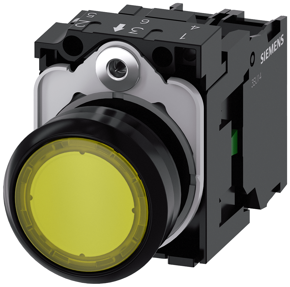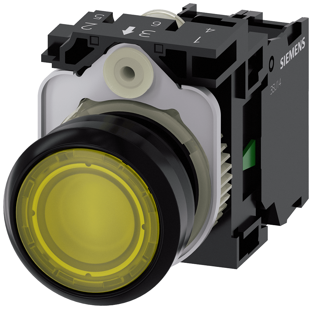 pulsante luminoso, 22 mm, rotondo, in plastica, giallo, bottone, piatto, ad impulso, con supporto, 1 NO, modulo LED con LED integrato AC/DC 24V, morsetto a vite Pulsanti luminosi SIRIUS ACT per la commutazione e il comando di utilizzatori elettrici. Siemens offre, sotto il nome commerciale SIRIUS ACT, un portfolio esclusivo di dispositivi di comando e segnalazione con omologazioni di prodotto per il mercato mondiale in tre moderne serie di design in robusto metallo puro e plastica pregiata.L'innovativo concetto di innesto a scatto semplifica talmente il montaggio che per eseguirlo basta una sola mano e non servono attrezzi speciali. Per i fori di montaggio sono sufficienti semplici fori non scanalati, essendo già integrata una protezione antirotazione al 100 %.Grazie al grado di protezione elevato i robusti apparecchi sono adatti all'impiego industriale e in ambiente esterno. È persino possibile la pulizia con getto ad alta pressione. Né polvere, né oli, né liscivia possono comprometterne il funzionamento affidabile.Oltre che con il cablaggio standard, gli apparecchi possono essere collegati al controllore anche tramite PROFINET, AS-Interface oppure IO-Link. Potete così ridurre il vostro onere di cablaggio, minimizzare le fonti di errore e ottenere maggiore flessibilità.Il configuratore online grafico supporta in modo confortevole la scelta e l'ordinazione di singoli apparecchi, pulsantiere e iscrizioni. È disponibile una documentazione completa (ad es. manuale, dati 3D, schema di collegamento). Esecuzioni fornibili: più colori, luminoso/non luminoso, con/senza iscrizione, comando permanente/ad impulso, diverse altezze di bottone e ghiera. Avvertenza: Apparecchio completo, fornitura incl. supporto e moduli. SIRIUS ACT - Performance in Action nel comando e nella segnalazione. Semplici da montare, altamente performanti, semplicemente perfetti.