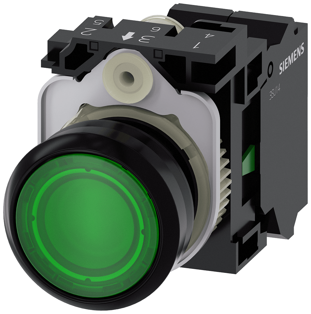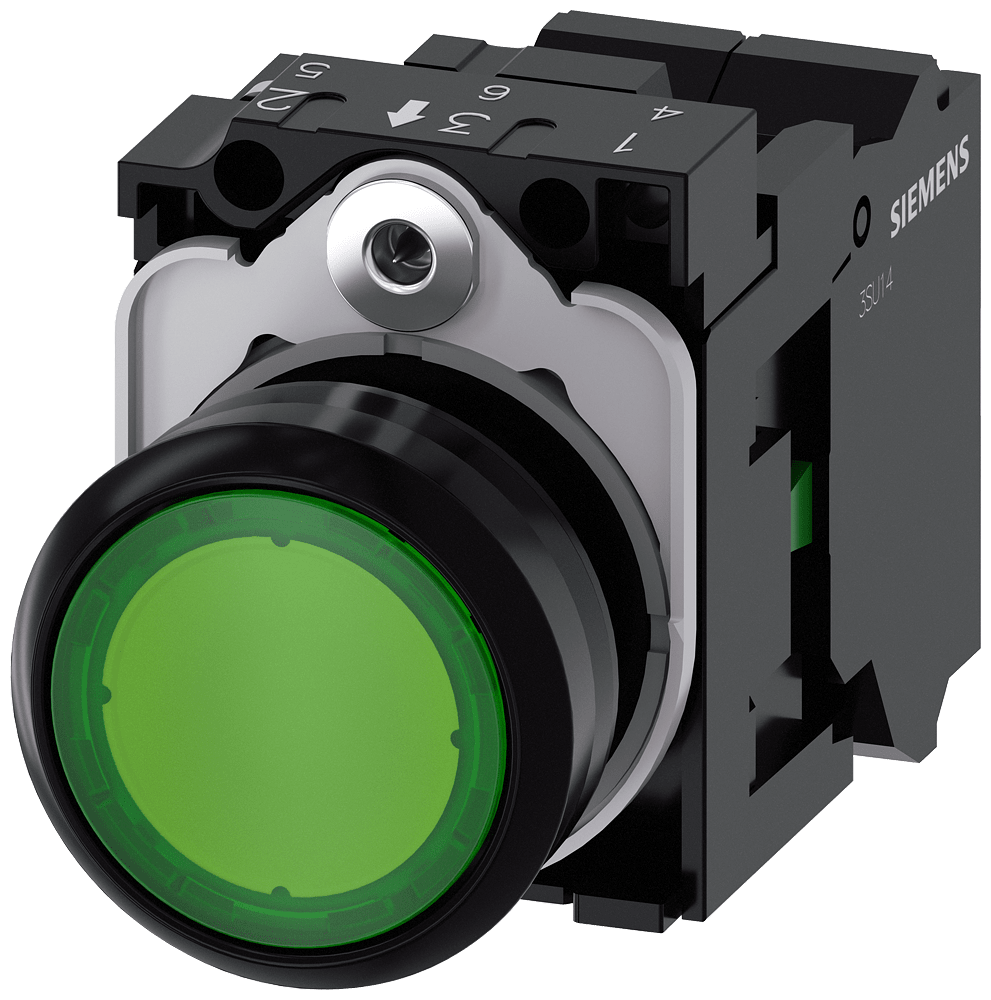 pulsante luminoso, 22 mm, rotondo, in plastica, verde, bottone, piatto, ad impulso, con supporto, 1 NO, modulo LED con LED integrato AC 110 V, morsetto a molla Pulsanti luminosi SIRIUS ACT per la commutazione e il comando di utilizzatori elettrici. Siemens offre, sotto il nome commerciale SIRIUS ACT, un portfolio esclusivo di dispositivi di comando e segnalazione con omologazioni di prodotto per il mercato mondiale in tre moderne serie di design in robusto metallo puro e plastica pregiata.L'innovativo concetto di innesto a scatto semplifica talmente il montaggio che per eseguirlo basta una sola mano e non servono attrezzi speciali. Per i fori di montaggio sono sufficienti semplici fori non scanalati, essendo già integrata una protezione antirotazione al 100 %.Grazie al grado di protezione elevato i robusti apparecchi sono adatti all'impiego industriale e in ambiente esterno. È persino possibile la pulizia con getto ad alta pressione. Né polvere, né oli, né liscivia possono comprometterne il funzionamento affidabile.Oltre che con il cablaggio standard, gli apparecchi possono essere collegati al controllore anche tramite PROFINET, AS-Interface oppure IO-Link. Potete così ridurre il vostro onere di cablaggio, minimizzare le fonti di errore e ottenere maggiore flessibilità.Il configuratore online grafico supporta in modo confortevole la scelta e l'ordinazione di singoli apparecchi, pulsantiere e iscrizioni. È disponibile una documentazione completa (ad es. manuale, dati 3D, schema di collegamento). Esecuzioni fornibili: più colori, luminoso/non luminoso, con/senza iscrizione, comando permanente/ad impulso, diverse altezze di bottone e ghiera. Avvertenza: Apparecchio completo, fornitura incl. supporto e moduli. SIRIUS ACT - Performance in Action nel comando e nella segnalazione. Semplici da montare, altamente performanti, semplicemente perfetti.